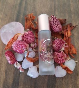 our signature blend is infused in fractionated coconut oil with dried peach flowers, globe amaranth buds and rose quartz crystals.